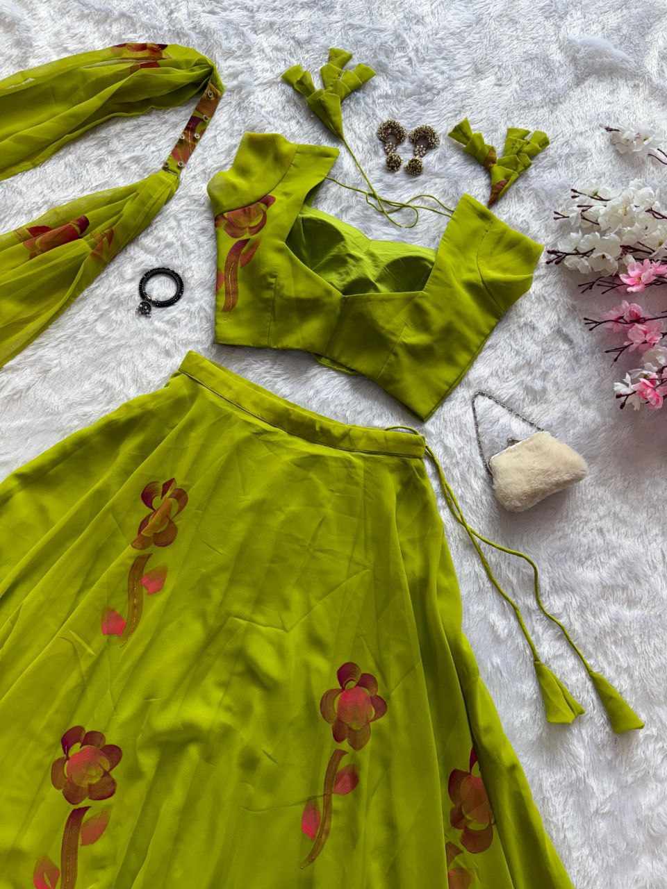 Lehenga – Pure georgette hand-painted lehenga with a grand 8-meter flair, finished with canvas patta